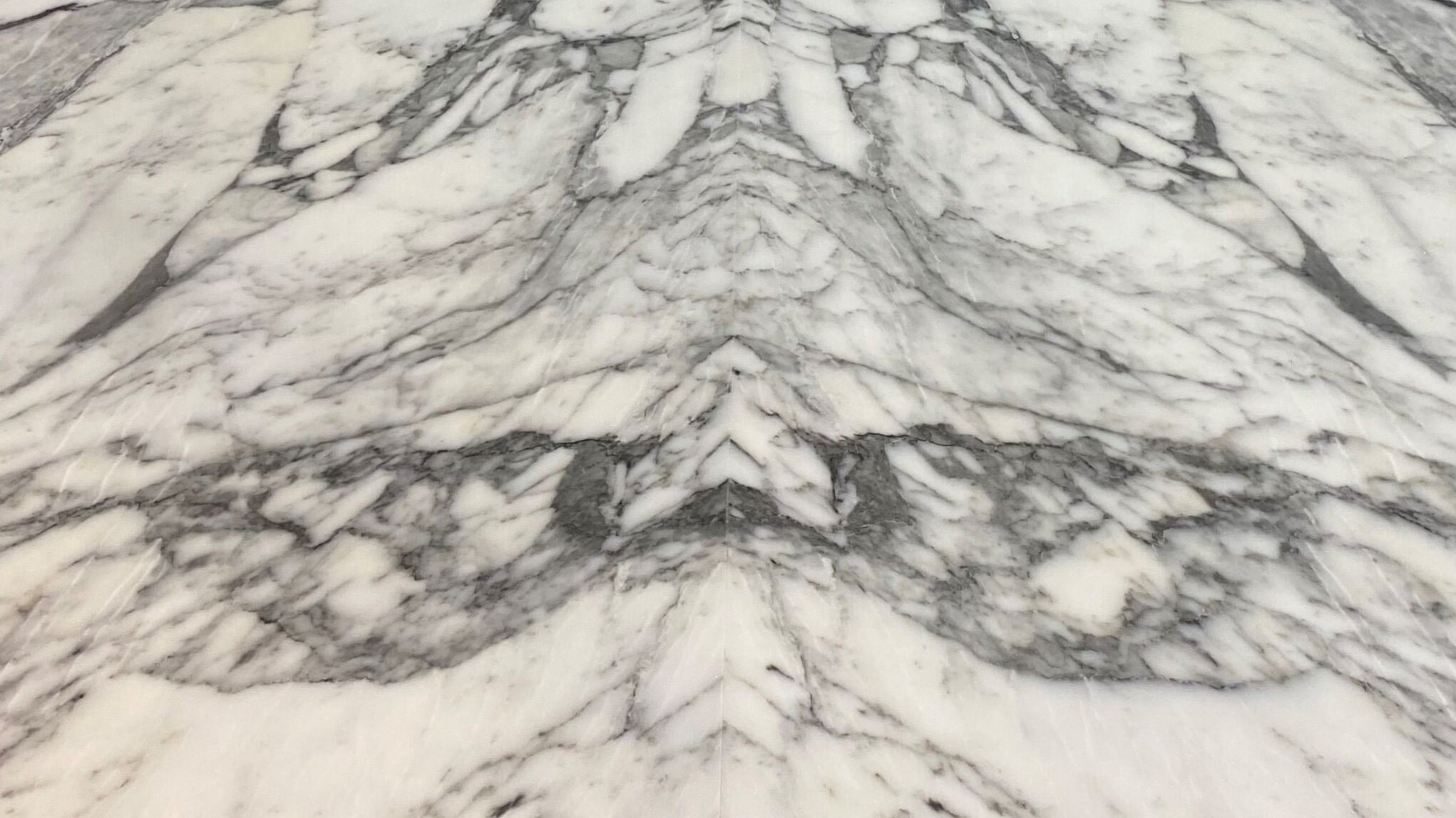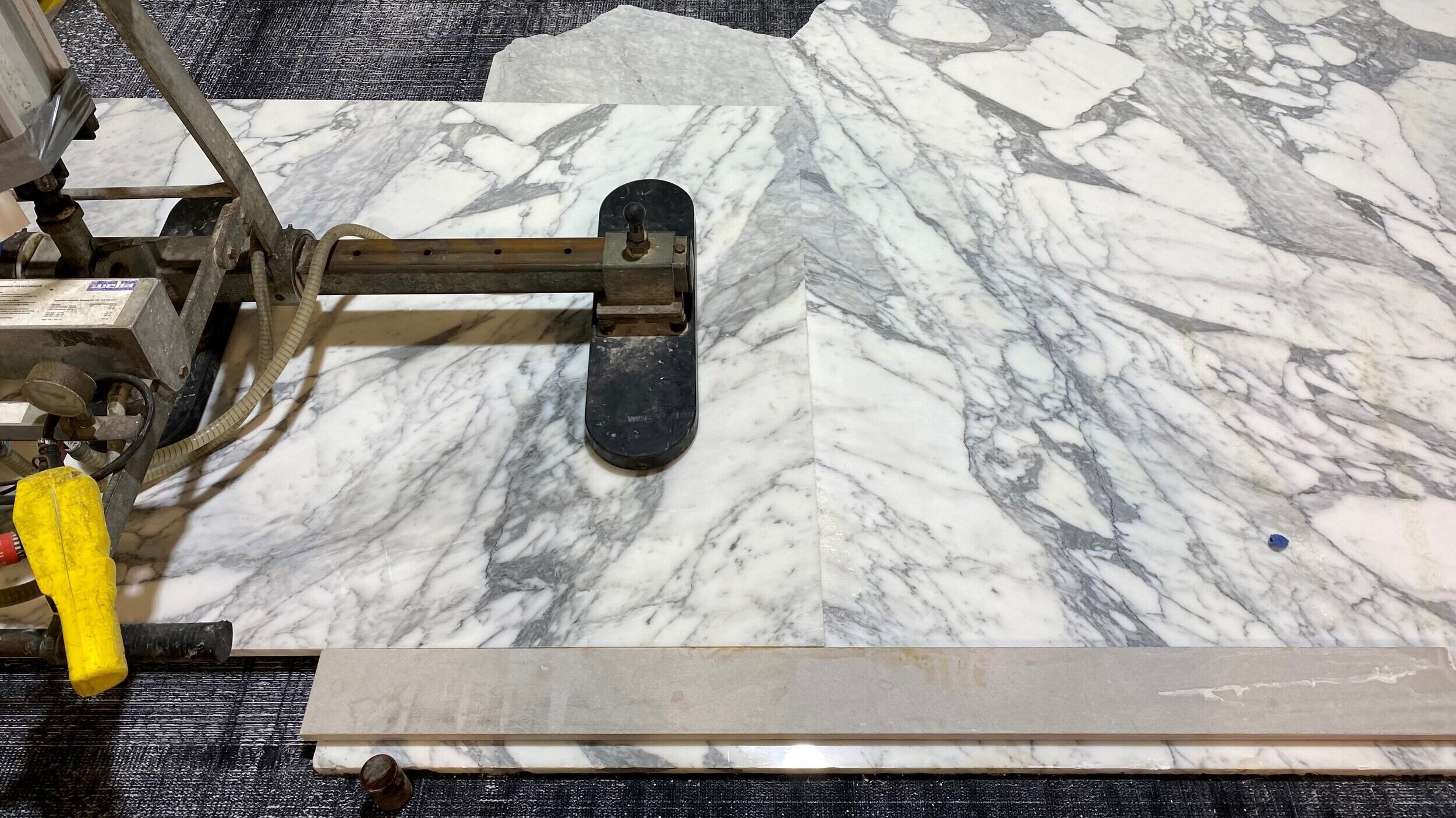 Naturally, the process starts at the source of the natural stone. Only the best pieces of natural stone are selected and used. In this blog we’re featuring a current project that uses Calacatta Statuario marble from Italy. The mirrored effect is achieved when our craftsmen slice the marble in two, ensuring the patterns fit together and creating a reflection of each other.