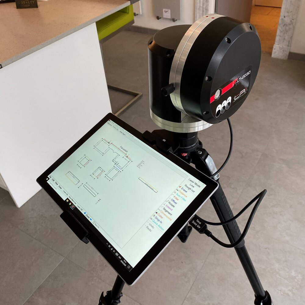 To take a digital laser template we set up the tripod, attach the laser to it, level it with a bubble on top, start the software and take the readings. Typically, this process usually takes a couple of hours to complete.
