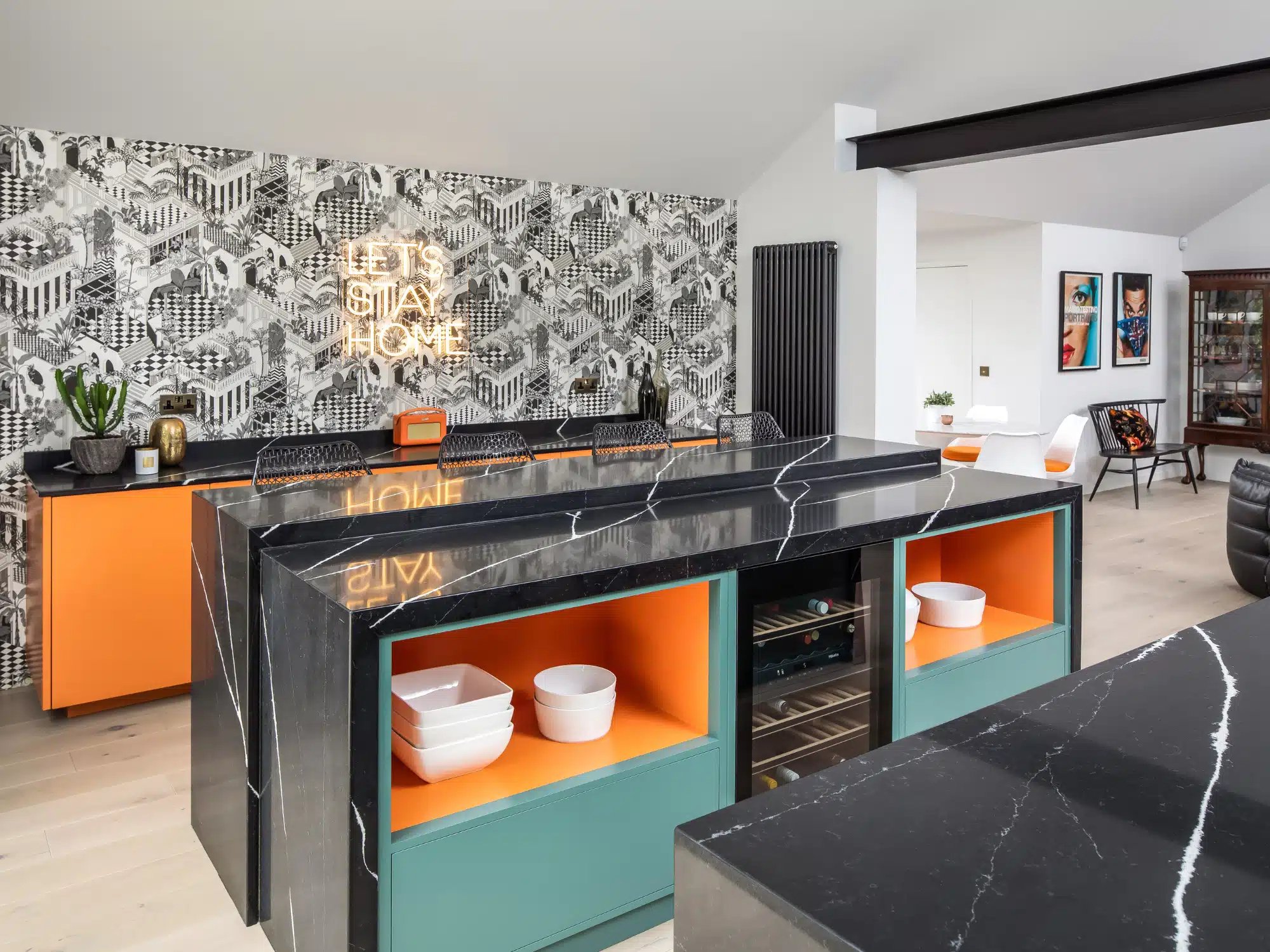 For this amazing, vibrant and striking Kitchen collaboration in Kent with Rencraft Kitchens we fabricated two bespoke Kitchen Islands using 60mm Et Marquina Quartz Worktops and Surfaces courtesy of Silestone. All finished off with beautiful Waterfall Ends.