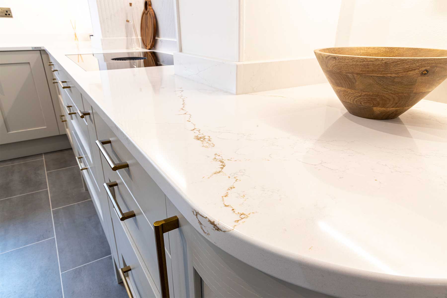 Do not seal – Do not apply sealants to quartz worktops and surfaces. Quartz is non-porous and does not require sealing. The sealant will sit on top of the surface, collecting dirt, dulling the surface and may be difficult to clean off.