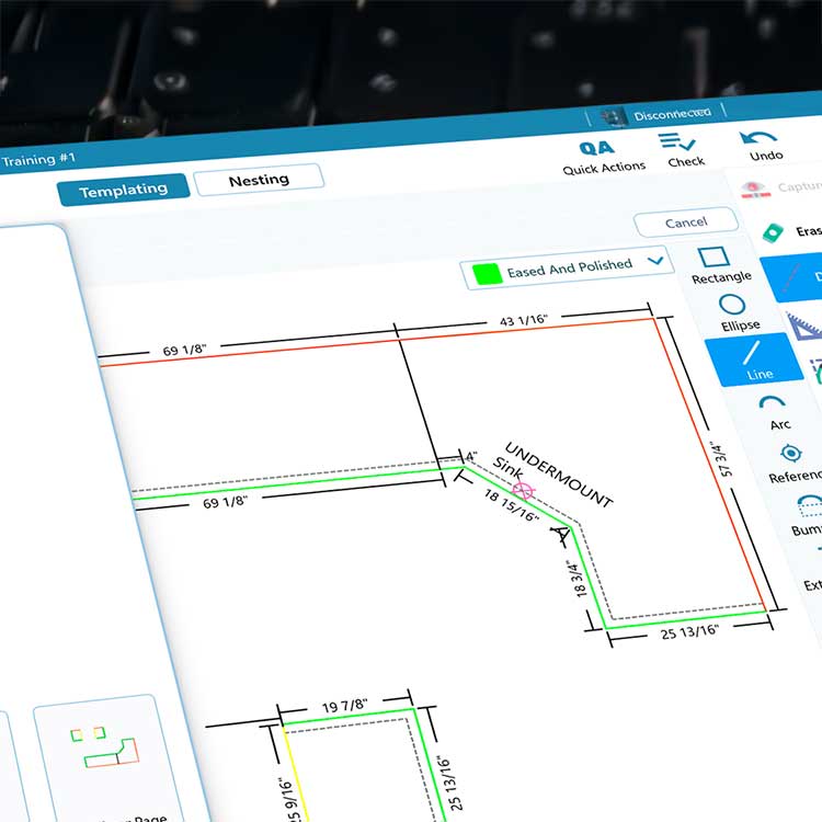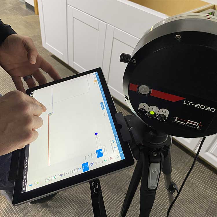 To ensure a high degree of accuracy, we utilise the innovative Laser Products LT-2D3D Laser Templator. Featuring an advanced tripod mounted laser connected to a tablet computer, this machine scans the area to create a 3D model and CAD drawing. Cut-outs for sinks and sockets can also be added to the rendering by our technicians as needed. This information is then fed directly into our computer-controlled saws and CNC machines for the stone to be precision cut, shaped, and finished. The result: shorter lead times, a better fit and tighter tolerances.